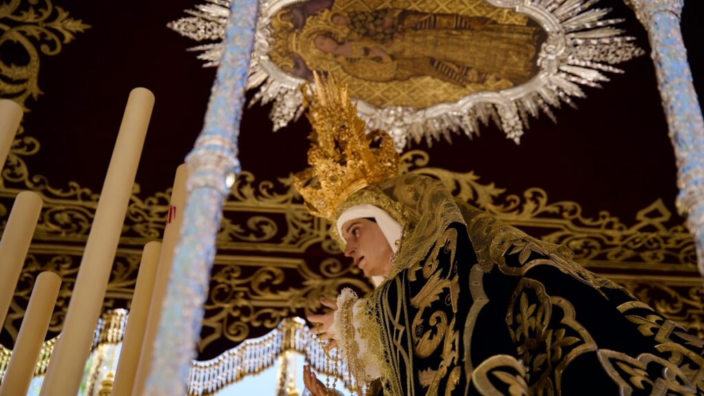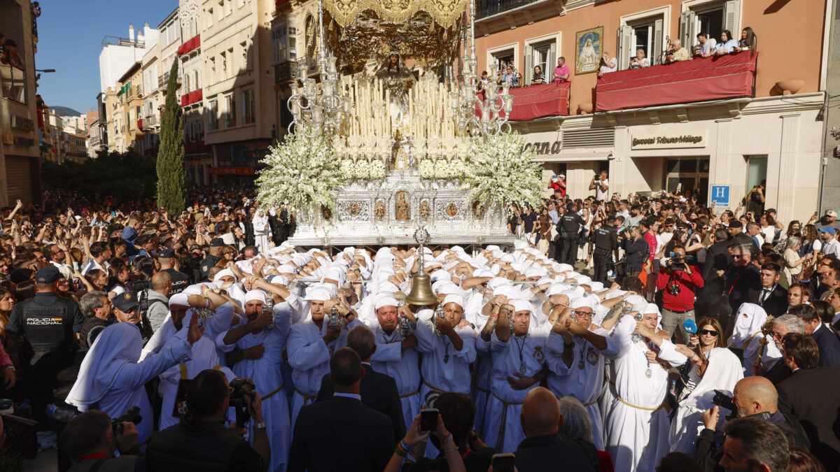 La Virgen del Rocío avanza por las calles de Málaga durante la procesión de este Martes Santo. | Jorge Zapata / EFE