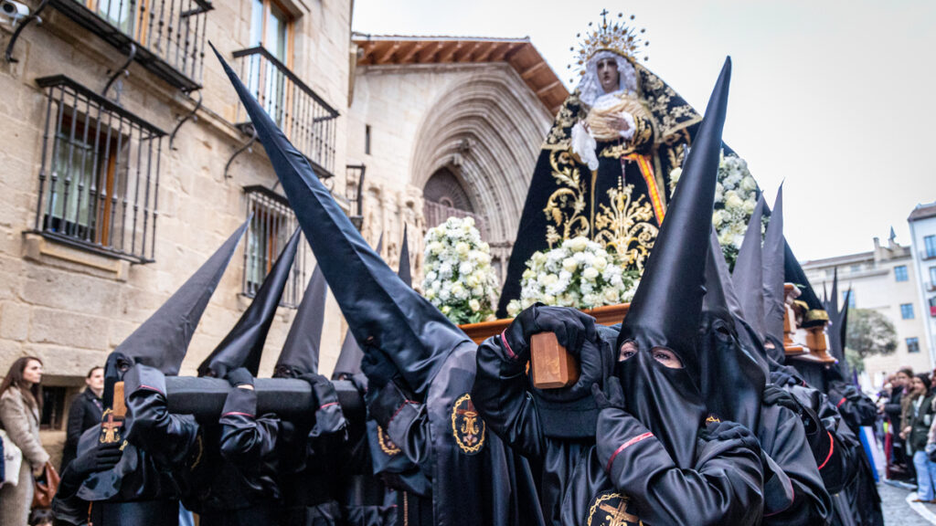 Una veintena de mujeres de la Cofradía de la Santa Cruz portan a la Virgen de Nuestra Señora del Rosario, en Logroño. | EFE/ Raquel Manzanares