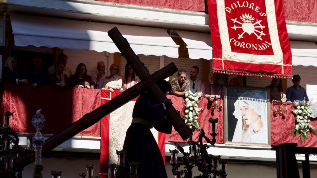 Nazarenos de la Hermandad del Cerro del Águila salen de la parroquia de los Dolores para iniciar su Estación de Penitencia en Sevilla durante el Martes Santo. | José Manuel Vidal / EFE