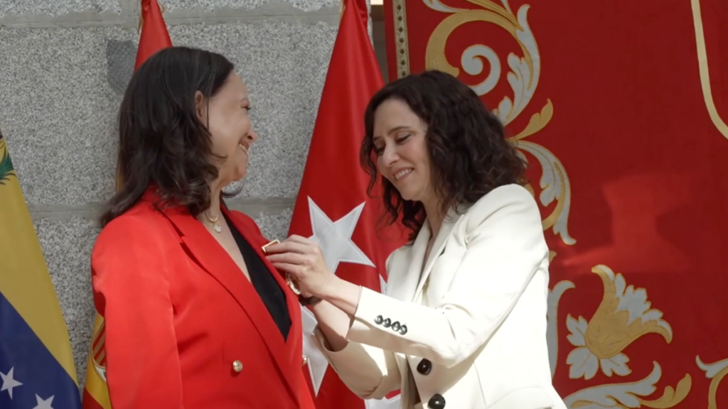 La líder opositora ha bajado a la plaza tras recibir la Medalla de Oro de la Comunidad de Madrid de manos de la presidenta regional, Díaz Ayuso