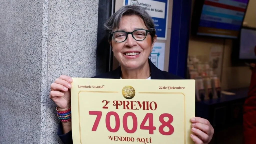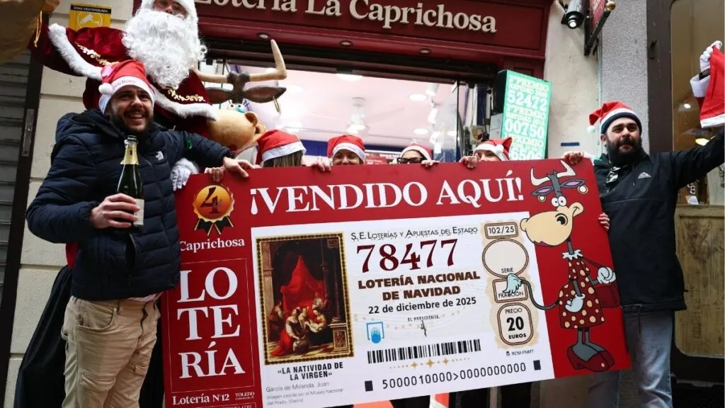 Alsice Ríos (i) y Piero Rai Chávez (d), cantan un cuarto premio, el 78.477. | Foto: Chema Moya (EFE)