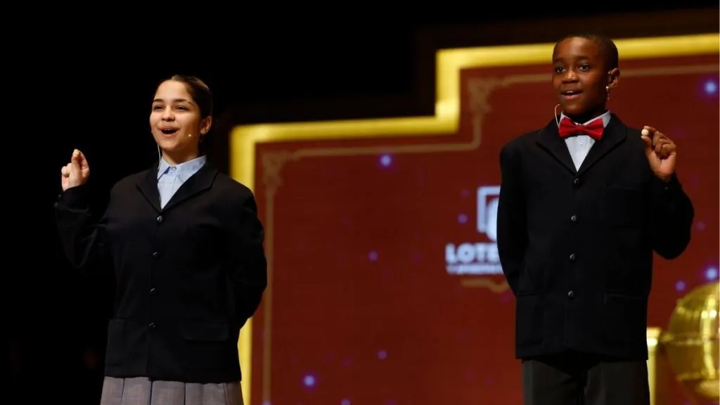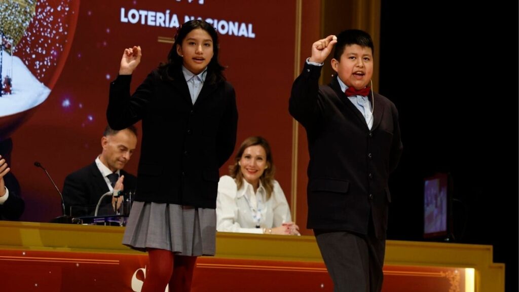 Samanta Fuster (i) y Ángel Abaga (d), los niños de la Residencia San Ildefonso del Ayuntamiento de Madrid encargados de cantar premio y número, respectivamente, de la primera tabla de del Sorteo Extraordinario de Navidad celebrado este lunes en el Teatro Real de Madrid. | Foto: Chema Moya (EFE)