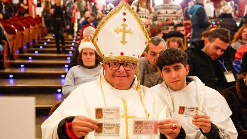Jesús Ruiz (i), el obispo de la lotería de León, que empezó el domingo a hacer cola en el Teatro Real para ser el primero en entrar al sorteo de Navidad. | Foto: Chema Moya (EFE)
