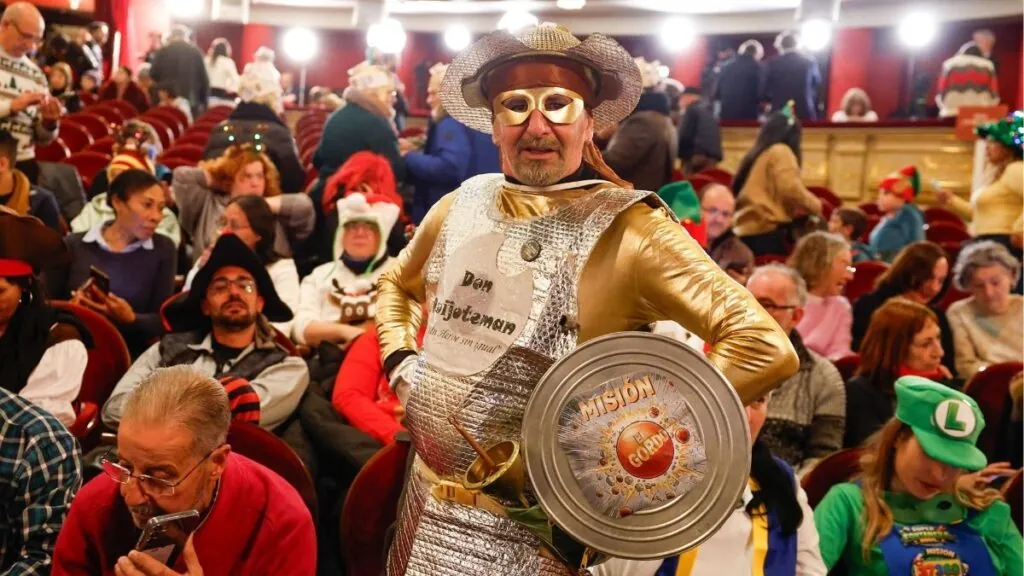 Un asistente al sorteo de Navidad disfrazado de Don Quijote. | Foto: Chema Moya (EFE)