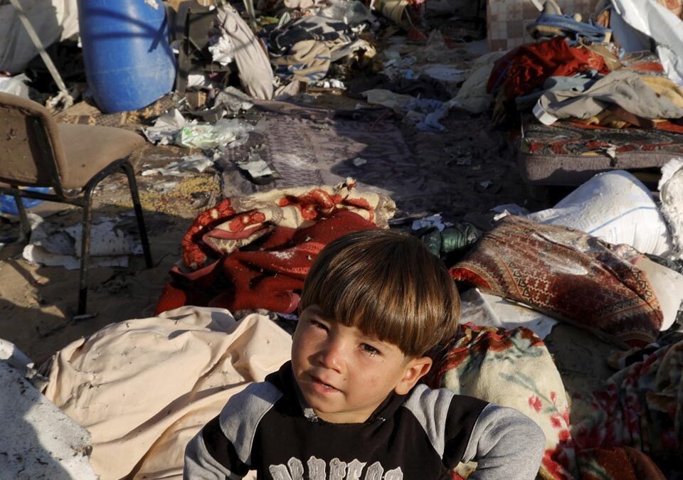 Un niño frente a una tienda de campaña que albergaba a personas desplazadas destrozada por un ataque de Israel, en Khan Younis, en el sur de la Franja de Gaza