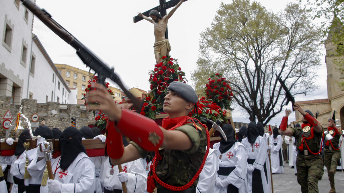 Soldados del regimiento 3 de Infantería de Cabo Noval acompañan el Vía Crucis del Santo Cristo de la Misericordia en la procesión que recorre hoy jueves las calles de Gijón.
