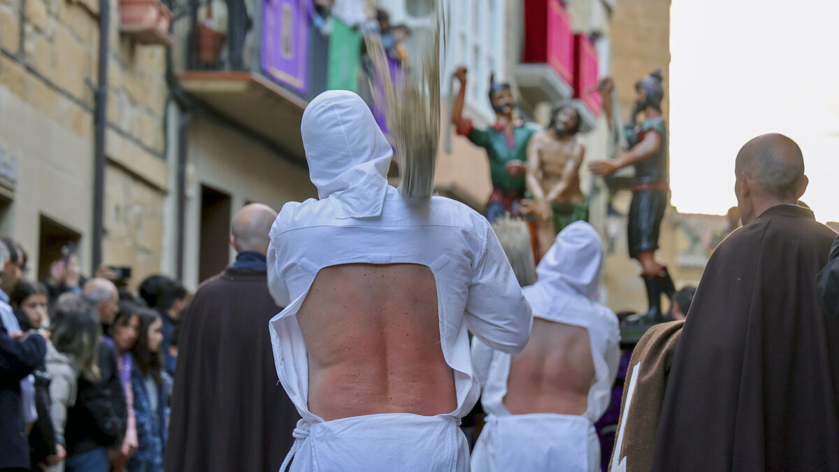 Doce disciplinantes han recorrido este Jueves Santo las calles de San Vicente de la Sonsierra, en La Rioja, para revivir la tradición medieval de Los Picaos