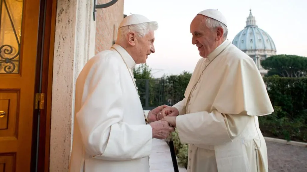 El papa Benedicto XVI bendice al nuevo papa tras su nombramiento