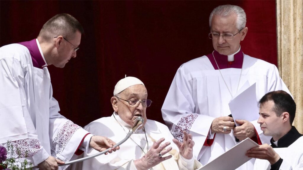 El Papa Francisco habla desde un balcón el día del mensaje «Urbi et Orbi» (a la ciudad y al mundo), en la Plaza de San Pedro, este Domingo de Pascua, en el Vaticano