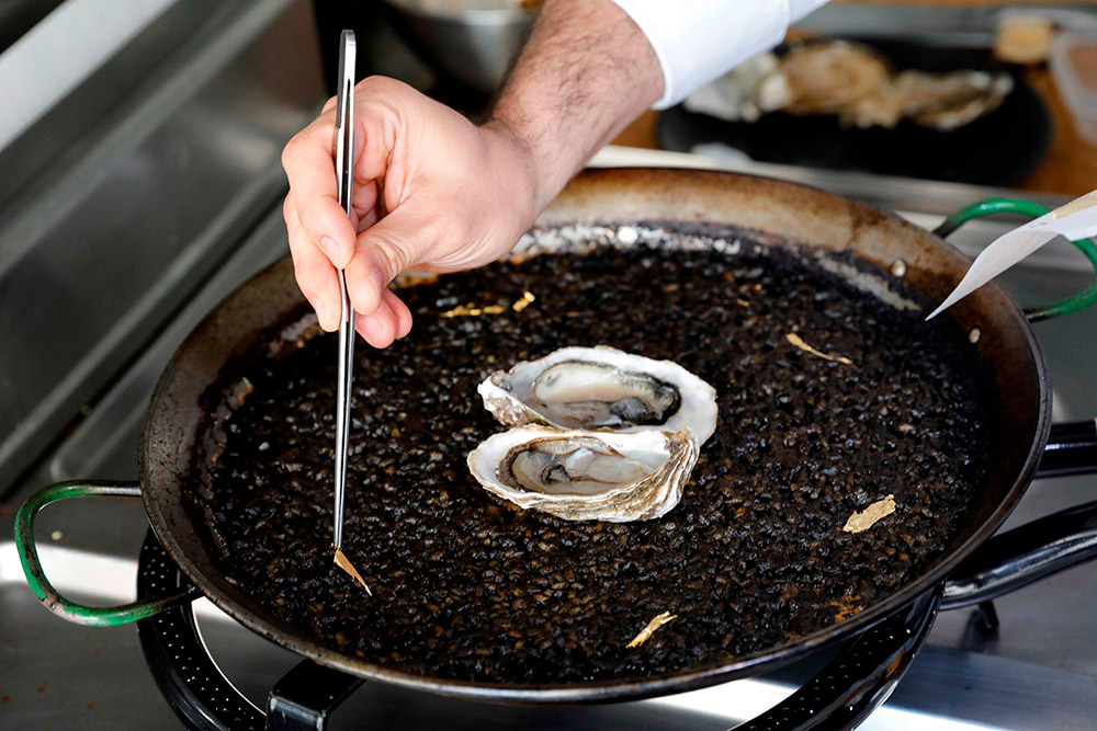 Helos aquí: ostra a la vainilla de Madagascar de Alexandre Couillon en La Marine (isla de Noirmoutier, País de Loira); ostras templadas al curry y al comino de Mathieu Guibert en el restaurante Anne de Bretagne (La Plaine-sur-Mer); ostras salvajes de La Camarga, con salsa XO y tocino de Florent Pietravalle en La Mirande (Aviñón); quisquilla de Santa Pola con emulsión de ostras y bullabesa de Fran Martínez en Maralba (Almansa); ostras, manzana y jugo de pepino y apio de Pepe Solla (Poio, Pontevedra); ostra con remolacha y polvo helado de yogur de Oriol Castro, Eduard Xatruch y Mateu Casañas, en Disfrutar (Barcelona) y ostras con algas y cítricos de Elena y Juan Mari Arzak.