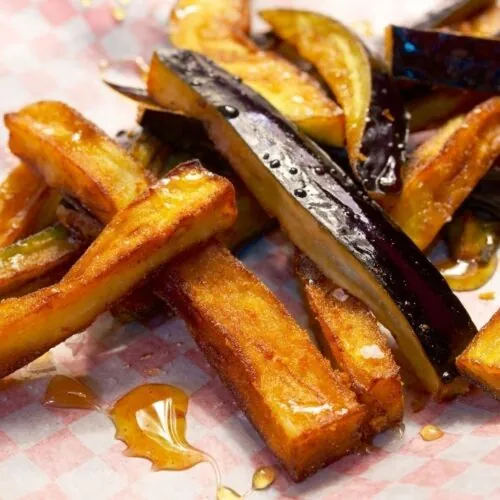 Por último, dispón las berenjenas fritas en un plato y rocíalas con miel de caña al gusto. Y sirve inmediatamente para disfrutar de su textura crujiente y sabor inigualable.