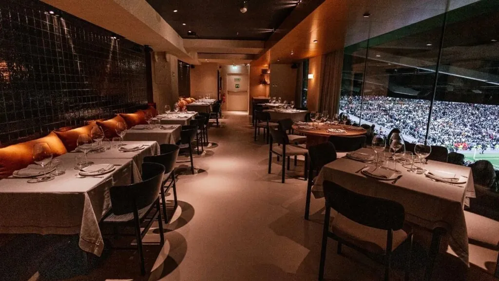 Al restaurante se accede por la puerta 28 del espacio y su cristalera, de más de 40 metros, ofrece una privilegiada panorámica sobre el campo de fútbol. El local tienen capacidad para 160 personas, 500 metros cuadrados divididos en dos plantas, y la carta del restaurante, con base en el producto de temporada, está definida por una cocina tradicional actualizada, como la del resto de sus establecimientos. Luego, en la bodega disponen de unas 600 referencias que también sirven por copas. Cuentan además con barra gastronómica, mesas altas incluidas, terrazas interior y exterior, y como partícipe del servicio VIP del club se permite el acceso directo a las gradas en días de partido.