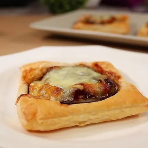 - Tartaletas de hojaldre con berenjena, aceitunas y queso feta: con sabor más mediterráneo, puedes combinar berenjena asada, aceitunas, queso tipo feta o queso de cabra.