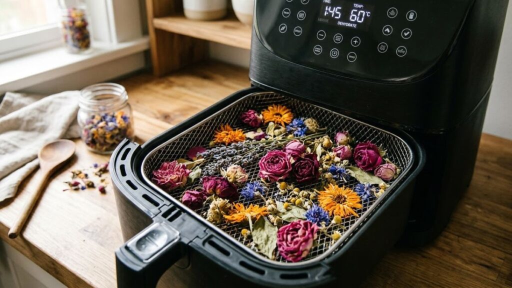 No hay límites en esta práctica, ya que puedes secar las flores que se te ocurra, pero eso sí no se hace como nosostros queramos sino que tiene una forma determinada. Lo primero es no elegir flores muy distintas ya que a lo mejor según la variedad floral necesitan más tiempo de en el AirFryer o menos. Por lo que se tienen que poner flores en una sola capa, ya que no se deben poner encima unas de otras, y comenzar con una temperatura baja como 45ºC o 50ºC. Algunos modelos cuentan con una función de deshidratadora pero si no es así, se puede hacer igual sin ningún problema.