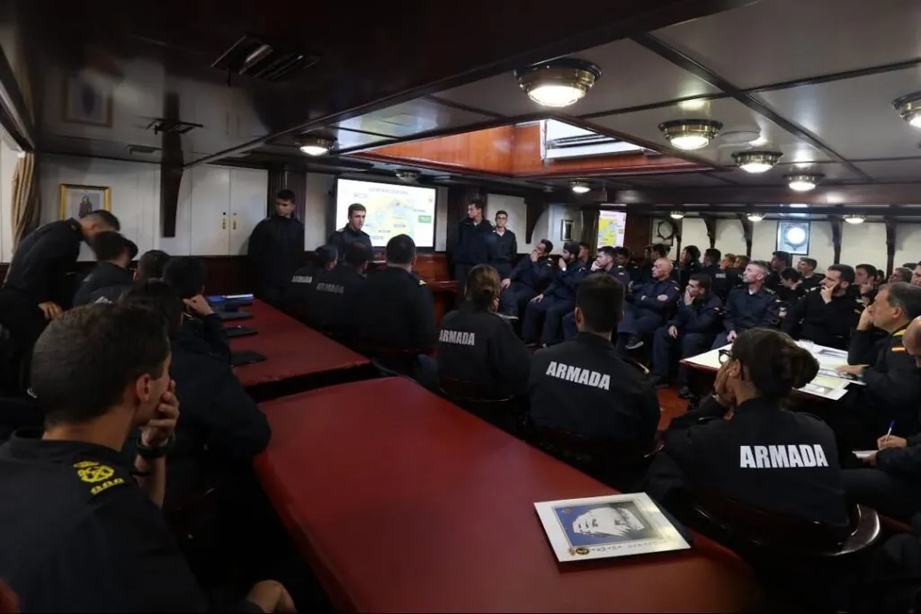 La sonrisa de la princesa refleja el buen ambiente que se ha creado entre sus compañeros de travesía. Que aparezca en la portada de la publicación también refleja su buen desarrollo en las rutinas del barco, de las que tuvo que descansar hace no tantos días por los mareos mencionados. En las demás fotografías se ve a otros guardamarinas en distintas salas de Elcano, con largas mesas para que se sienten todos y tengan buena visión de los proyectores en las paredes. Observan mapas meteorológicos y geográficos, que se analizan de forma habitual en sus lecciones teóricas. El programa académico incluye asignaturas de Navegación, Astronomía, Meteorología, Operaciones Anfibias, Apoyos y Servicios de Combate y Maniobra.