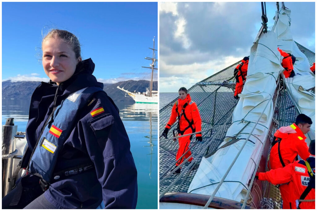 El uniforme para estos ejercicios es de verano, cuando el tiempo acompaña y pueden disfrutar del sol del Pacífico. En otros momentos el temporal les obliga a cambiarse al uniforme de invierno. Una de las fotografías inéditas retrata a Leonor con un traje naranja fosforito que le protege todo el cuerpo del frío de la Patagonia. Se tomaría a finales de marzo, cuando cruzó el Estrecho de Magallanes y se acercó al punto más al sur de todo el continente. En otra de las estampas se aprecia un detalle muy comentado en toda la etapa formativa militar de la princesa. Se ve a Leonor sentada en un bote, con Elcano y unas montañas de fondo, luciendo su etiqueta de guardiamarina ‘de Borbón y Ortiz’ en el chaleco salvavidas.