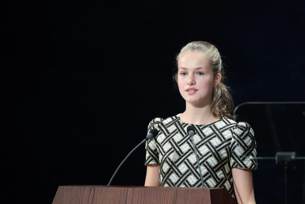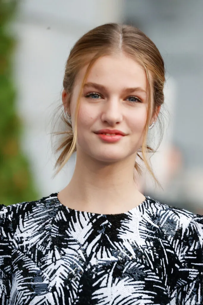 En su primera aparición en estos premios —por aquel entonces tenía 13 años—, Leonor optó por un vestido azul pastel con cuello redondo y manga francesa, falda con algo de vuelo, acorde a su edad. Complementó con bailarinas doradas planas, lo que reforzaba su perfil juvenil y menos solemne. En 2020, la princesa sorprendió con un conjunto en tono champagne con cuerpo brocado lleno de pedrería y falda midi lisa, señalando un giro hacia un estilo más formal. También fue la primera vez que lució tacones, lo que marcaba una transición de estilo hacia mayor madurez. Para la edición de 2022, Leonor eligió un vestido bicolor —en blanco y negro— estampado de corte recto, por encima de la rodilla, de la casa Michael Kors y con un moño bajo trenzado que aportaba sofisticación. Este look reflejaba ya un estilo más pulido, menos infantil.