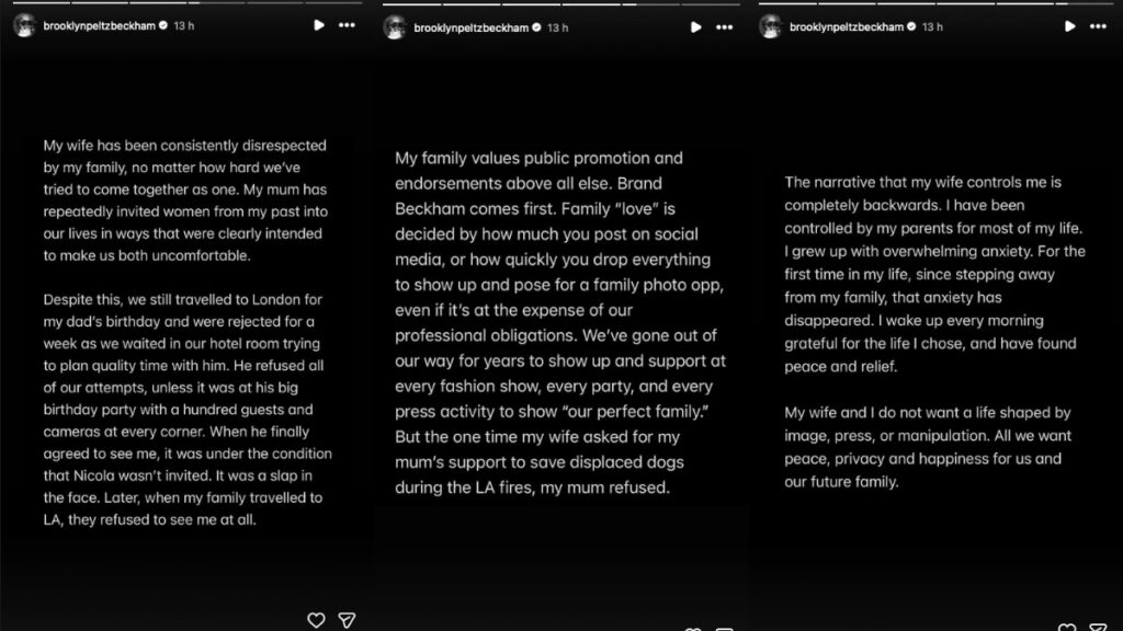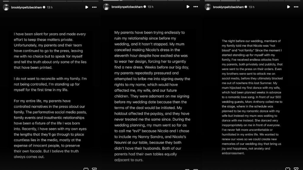 Uno de los puntos más graves es la acusación de que sus padres intentaron «sobornarlo» semanas antes de la boda para que cediera los derechos de su nombre —es decir, su marca personal— antes de casarse. Al negarse, afirma que el trato hacia él cambió radicalmente. Brooklyn explica que desde que se alejó de su familia, su «ansiedad abrumadora» ha desaparecido. Ha sido tan drástico el corte que recientemente envió una carta de «cese y desista» a sus padres, exigiéndoles que cualquier comunicación futura se realice exclusivamente a través de abogados. Además, también ha contado que viajó hasta Londres para estar presente en el 50º cumpleaños de su padre, pero que no le dejaron participar en él. Cuando finalmente accedieron a verlo, la condición era que Nicola no estuviera invitada, algo que él consideró una «bofetada en la cara». También, ha hablado de lo que quiere para su futuro: «Mi esposa y yo no queremos una vida moldeada por la imagen, la prensa o la manipulación. Todo lo que queremos es paz, privacidad y felicidad para nosotros y nuestra futura familia».