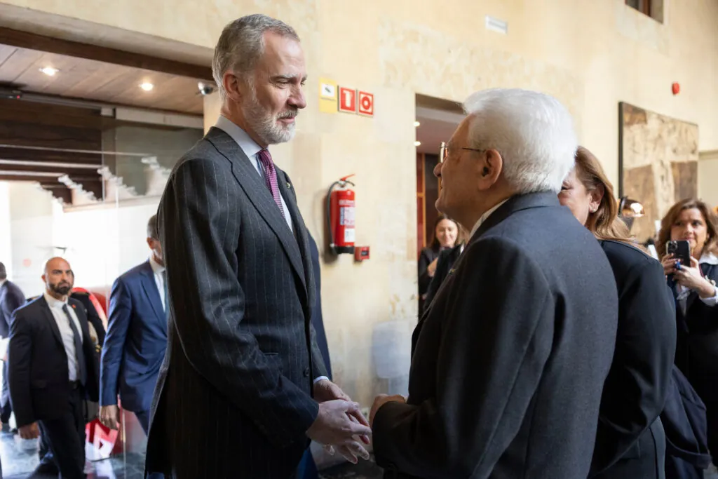 Antes de llegar a la Plaza Mayor, el Rey y Mattarella realizaron un recorrido a pie por el corazón de Salamanca. El paseo comenzó en la Plaza de Anaya, donde se detuvieron a hacerse una fotografía con varios estudiantes italianos de Erasmus. Después continuaron por la Catedral y la calle Rúa Mayor hasta terminar en la terraza donde tomaron el café. Un itinerario sencillo que sirvió para mostrar al presidente italiano algunos de los rincones más emblemáticos de una de las ciudades universitarias más reconocidas de España, y que dejó imágenes de lo más distendidas entre los dos mandatarios.
