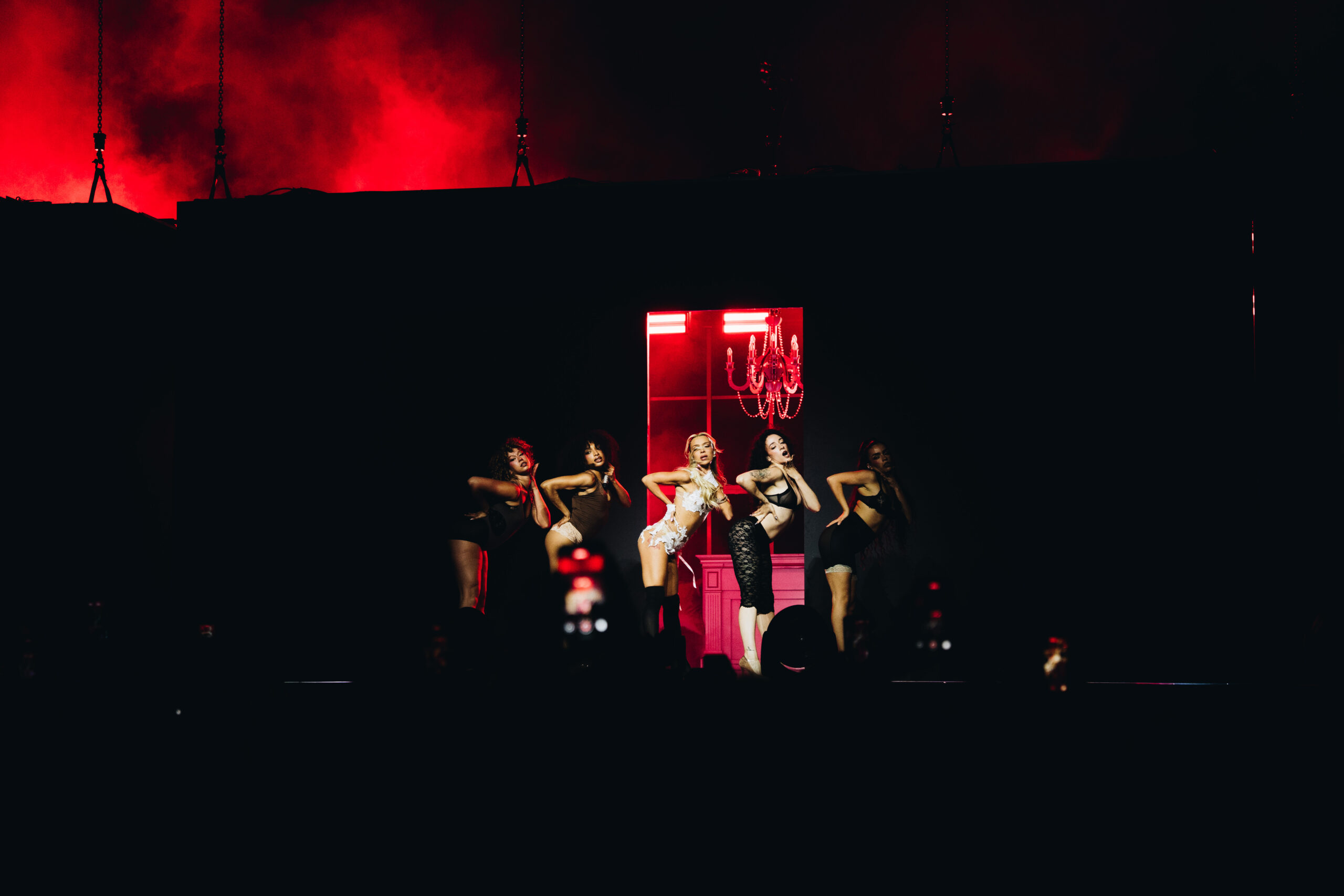 Desde el primer minuto, con Un coro y ya marcando el potente arranque, la artista dejó claro que lo suyo no es un concierto al uso. Es una experiencia estética y sensorial en la que todo gira en torno al deseo. Lencería blanca, ligas negras, tacones imposibles, extensiones rubias y una escenografía que remitía a un club de scorts de alto nivel: sofás, cojines, espacios íntimos, barras…. componían un universo en el que lo sexy se estiraba hasta lo excesivo. Y, sin embargo, ahí está la clave del éxito de Bad Gyal: ella no suaviza su propuesta —nunca lo ha hecho—, sino que la lleva hasta el límite. «Parece un vídeo porno», comentaba parte del público. Y probablemente esa era exactamente la intención del concierto, que estuvo perfectamente medido y coreografiado durante las casi dos horas que la joven puso al Movistar Arena a gritar y a perrear hasta el suelo.