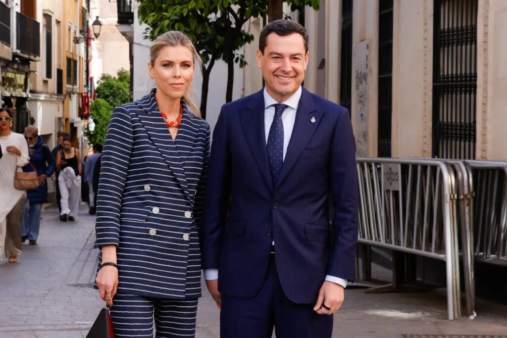 Juanma Moreno, en la Semana Santa de Sevilla, junto a su mujer y Amaia Salamanca. | Gtres