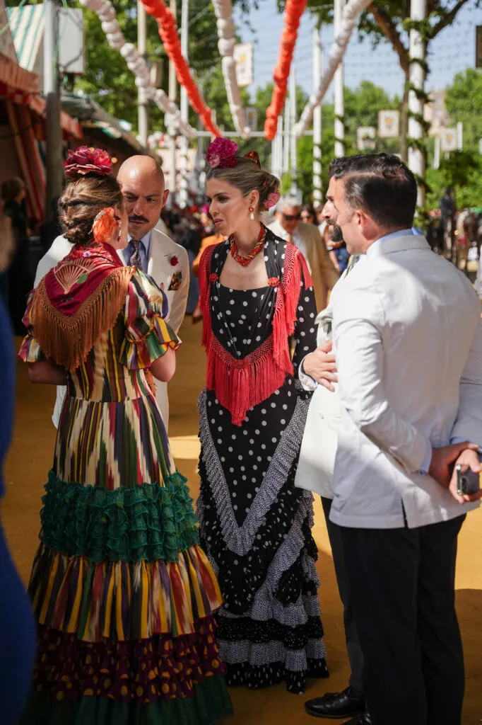 Y, también, su éxito reside en el uso del mantoncillo, un elemento que define a toda mujer que pone un pie en la Feria. Siempre lo lleva perfectamente cruzado o sujeto, realzando la silueta y combinando los colores de los flecos con el estampado de forma magistral. A menudo elige trajes de líneas sencillas para que sea la artesanía del mantoncillo —con bordados a mano o seda de calidad— la que eleve el look a la categoría de alta costura.