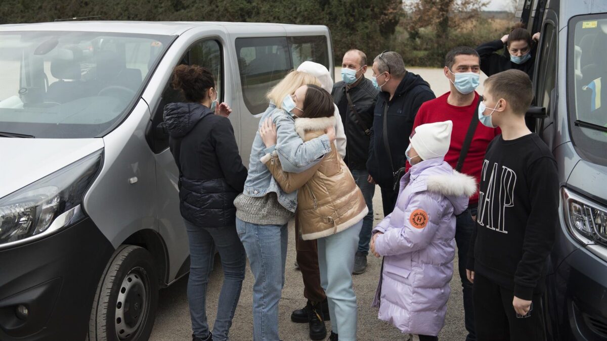 Una mujer abraza a una niña ucraniana a su llegada a Riudellots de la Selva (Gerona). | Glòria Sánchez (EP)
