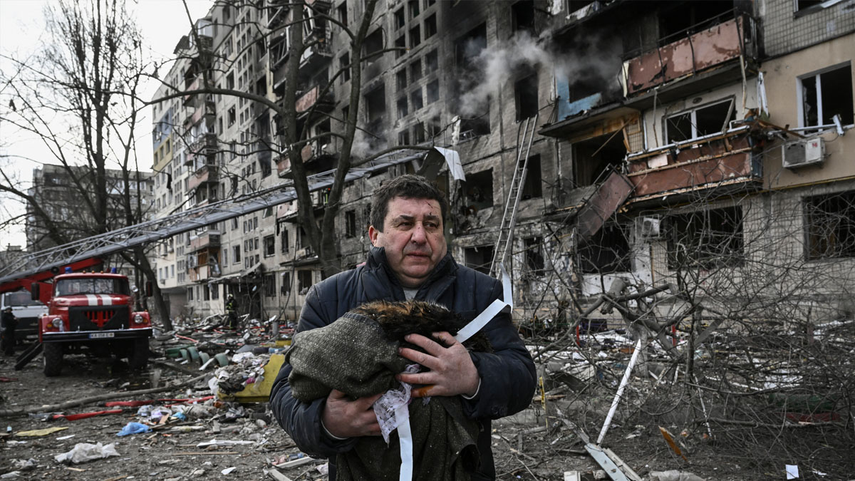 Un hombre sostiene a su gato muerto en un edificio de viviendas de kiev destruido por un bombardeo ruso. | ARIS MESSINIS (AFP)