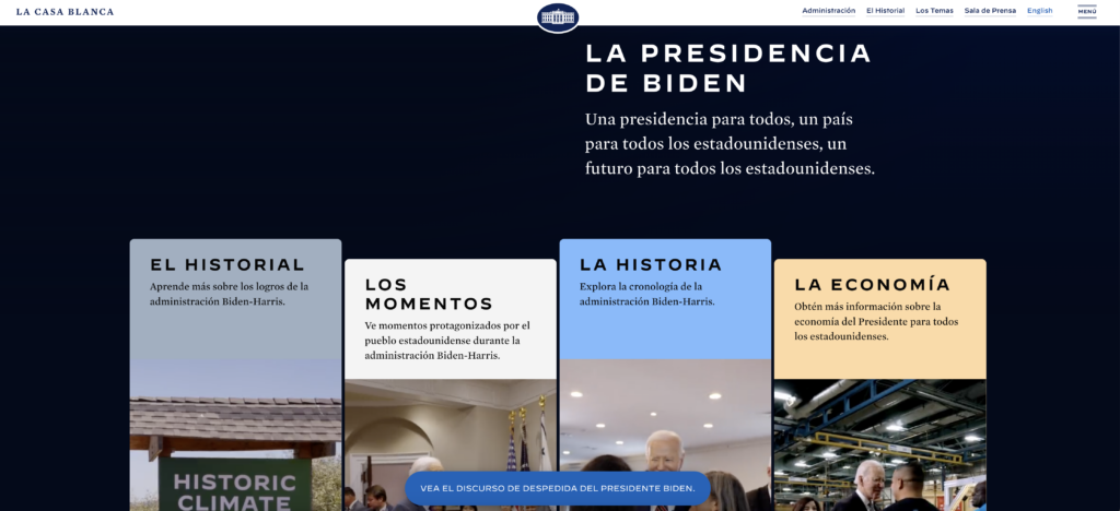 La Web en español estuvo activa al menos hasta este lunes a las 17.55 horas, como ha podido comprobar THE OBJECTIVE. En ella aparecía el último discurso de Joe Biden así como un repaso de su administración y sus políticas económicas.