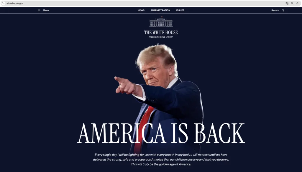 Lo que también ha cambiado ya es la cuenta de la red social X de la Casa Blanca en inglés, donde se ha colocado en cabecera una fotografía de una bandera estadounidense con la frase “America is BACK” y se ha colocado el siguiente mensaje principal: «La edad de oro de Estados Unidos comienza ahora mismo».