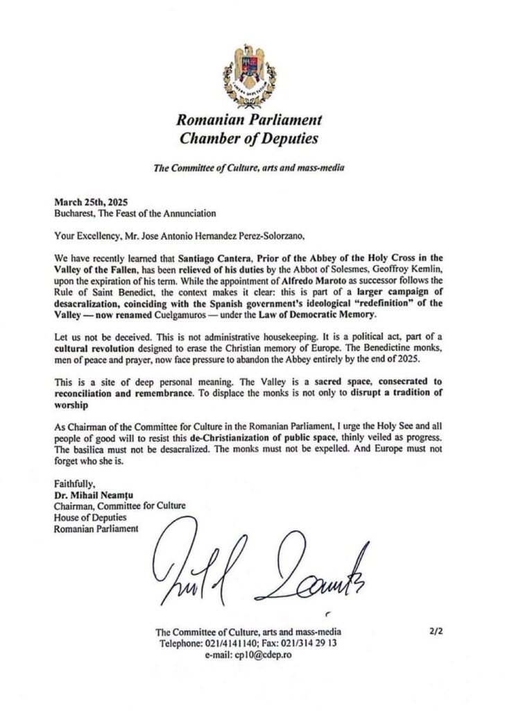 Neamțu denuncia que se está ejerciendo presión sobre los monjes para que abandonen la abadía antes de finales de 2025, y califica el Valle como un «espacio sagrado, consagrado a la reconciliación y la memoria». «Desplazar a los monjes no solo es interrumpir una tradición de culto, es romper con un símbolo de paz», subraya.