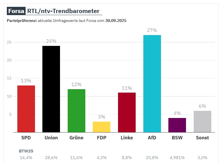 AfD con un 27% se sitúa a 3 puntos porcentuales de la CDU y la CSU mientras la popularidad de Merz está en su mínimo histórico