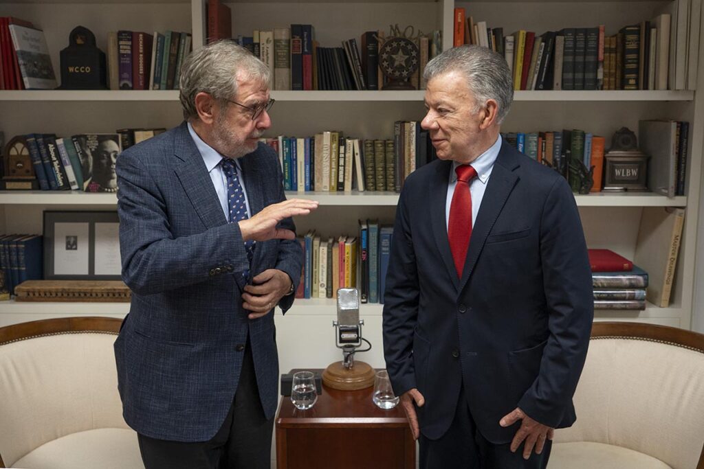 Esta semana, en Conversaciones con Cebrián, el protagonista es Juan Manuel Santos, expresidente de Colombia. Nacido en Bogotá en 1951 en el seno de una familia ligada a los medios de comunicación y a la política. Licenciado en Economía y Administración de Empresas por la Universidad de Kansas, amplió posteriormente sus estudios en Harvard. Miembro del Partido Liberal Colombiano, antes de ser Presidente ocupó las carteras de Comercio Exterior, de Hacienda y Crédito Público y de Defensa Nacional. Fue presidente de la República de Colombia desde 2010 hasta 2018. En el año 2016 recibió el premio Nobel de la Paz por, según reza textualmente el Comité Noruego, «sus esfuerzos resolutos y valientes para poner fin a la guerra civil del país de más de 50 años de duración». Actualmente, es el presidente de la Fundación Compaz, que creó para promover la paz y luchar contra la pobreza a través del liderazgo. Además, es miembro de varias juntas directivas de diversas fundaciones y profesor visitante de la universidad de Oxford.