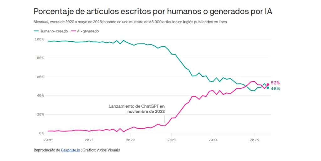 Los nuevos artículos generados por IA superaron brevemente en número a los escritos por humanos en línea, pero ahora los dos son aproximadamente iguales, según un nuevo informe de la empresa de SEO Graphite. Los investigadores han temido durante mucho tiempo que si el contenido creado por IA en línea supera al material creado por humanos, los grandes modelos de lenguaje podrían ahogarse en sus propios gases y colapsar…
