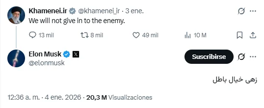Ese apagón informativo ha sido parcialmente burlado gracias a sistemas de comunicación por satélite como Starlink, propiedad de Elon Musk. La difusión de vídeos de la represión ha tenido un efecto multiplicador tanto dentro como fuera de Irán. Musk llegó incluso a responder públicamente al líder supremo, Ali Jamenei, después de que este asegurara que el régimen «no será derrotado» y que las protestas solo «sacuden» al sistema. El empresario replicó en farsi con una expresión persa muy conocida, equivalente a calificar sus palabras de «falsa ilusión», una frase que, según múltiples grabaciones, ha sido adoptada por los propios manifestantes y coreada en las protestas. En este sentido, Musk decidió cambiar también este fin de semana la bandera iraní en los emojis de X por la bandera histórica de Persia con el león y el sol que también era usada en los tiempos de la monarquía.