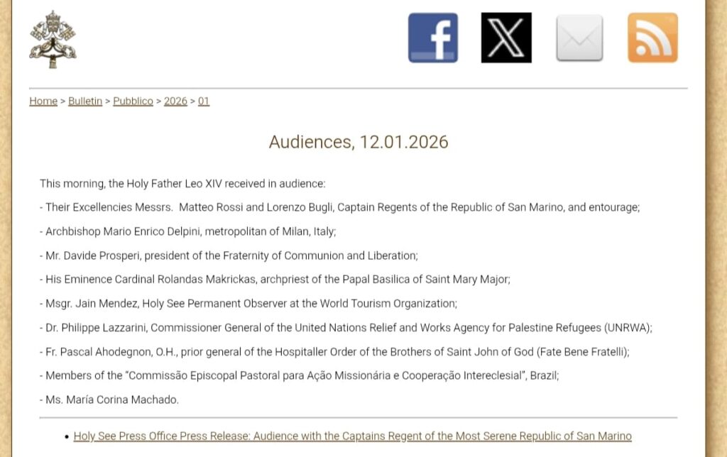 El Vaticano no ha dado detalles sobre la audiencia con Corina Machado y se ha limitado a publicar el nombre de ella en una lista de personas recibidas por el Papa este lunes por la mañana.