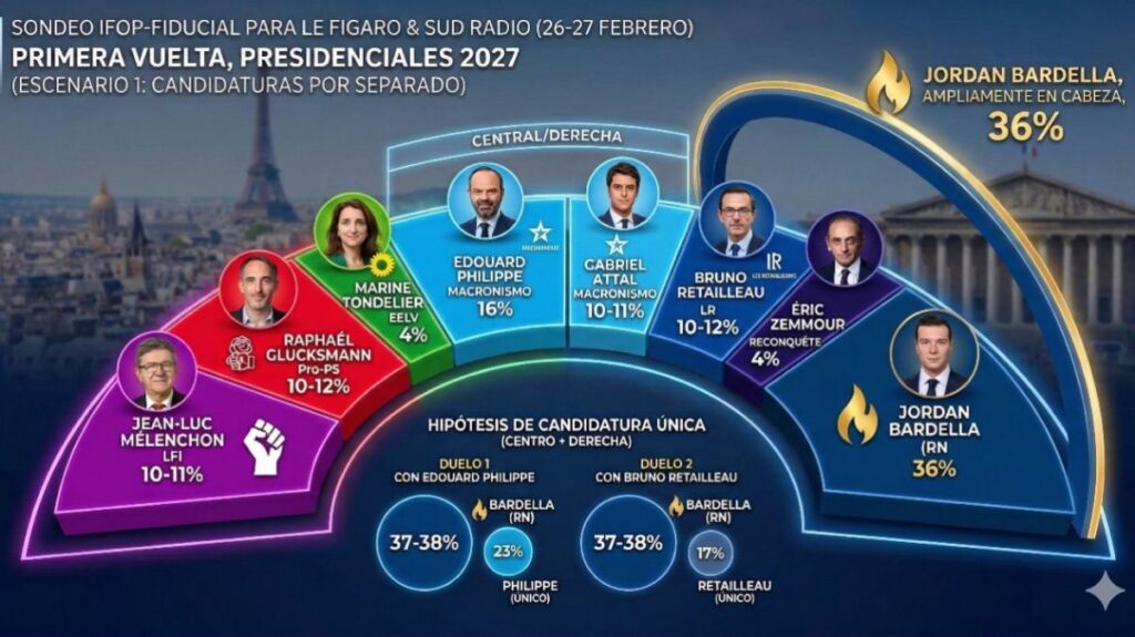 Ifop-Fiducial ha puesto a prueba, en esta encuesta realizada el 26 y el 27 de febrero, la hipótesis de que hubiera una candidatura única del macronismo y de la derecha clásica, y en ese caso la diferencia en una primera vuelta entre Bardella y su primer seguidor sería netamente menor.