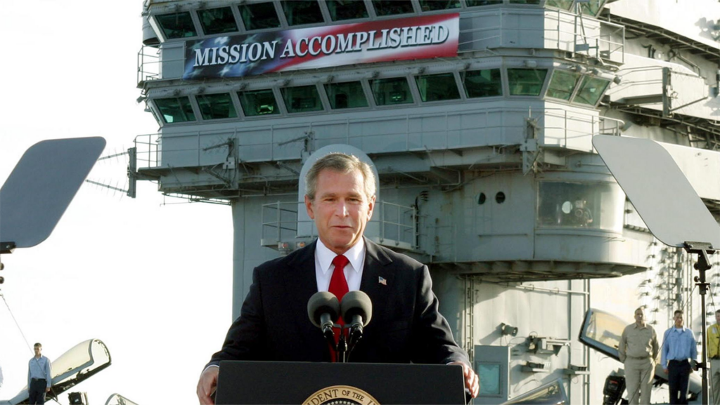 La historia reciente ofrece advertencias claras. El 1 de mayo de 2003, el presidente George W. Bush anunció prematuramente el final de la guerra de Irak a bordo del portaaviones USS Abraham Lincoln, bajo el célebre cartel de «Mission accomplished» («Misión cumplida»). Aquella proclamación simbolizaba la idea de que la caída del régimen de Sadam Huseín equivalía a una victoria estratégica.