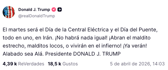 «El martes será el Día de la Central Eléctrica y el Día del Puente, todo en uno, en Irán. ¡No habrá nada igual!!!», escribió Trump en un mensaje en su red social, Truth Social. «Abrid el puto estrecho, malditos locos, o viviréis en el infierno. ¡YA LO VERÉIS! Alabado sea Alá», añadió el republicano.