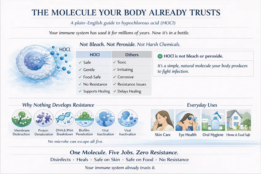 Imagina que te cortas un dedo. En cuestión de segundos, antes incluso de que te pongas una venda, tu cuerpo ya ha desplegado su primera línea de defensa química. En el interior de los glóbulos blancos que acuden a la herida, se produce una reacción extraordinaria: el peróxido de hidrógeno se transforma, gracias a una enzima llamada mieloperoxidasa, en un potente oxidante antimicrobiano que aniquilará bacterias, virus, hongos y prácticamente cualquier otro microorganismo que intente aprovecharse de la herida abierta. Esa molécula es el ácido hipocloroso. Y tu sistema inmunitario la ha utilizado durante millones de años. Lo extraordinario es que los científicos han logrado embotellarlo.