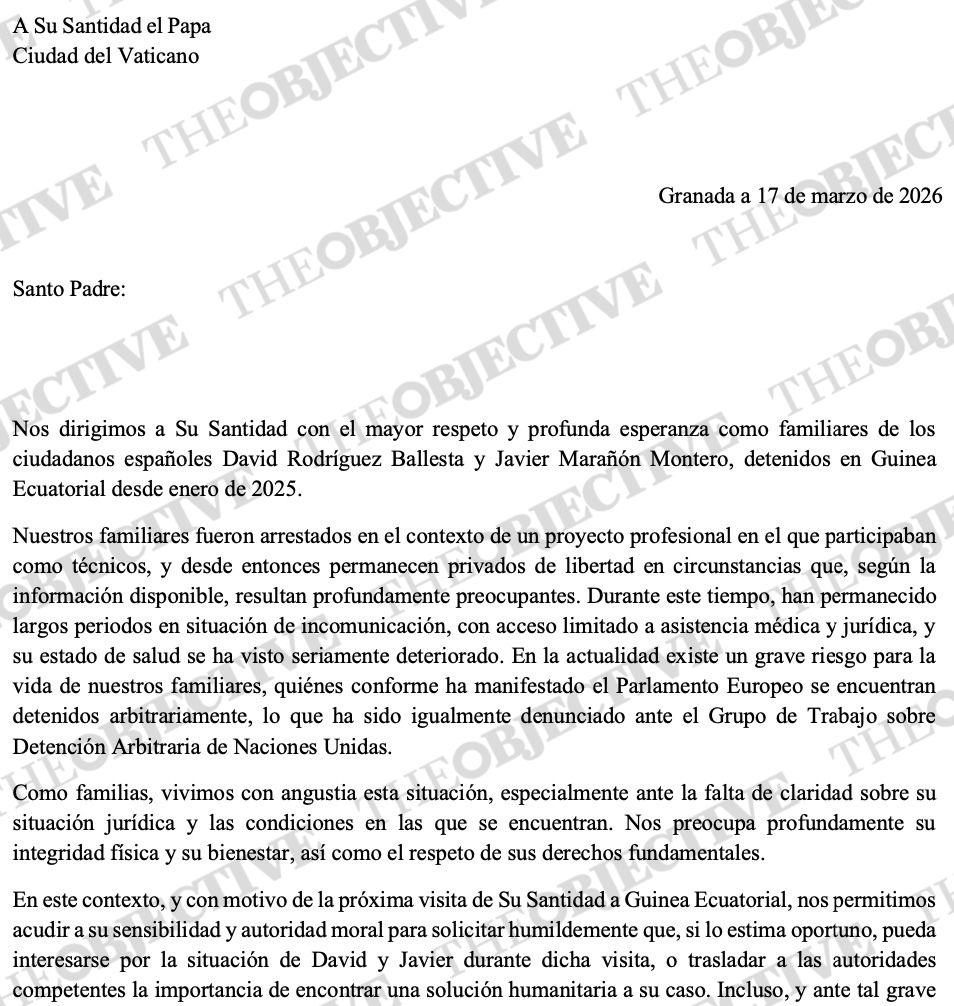 «Nos dirigimos a Su Santidad con el mayor respeto y profunda esperanza como familiares de los ciudadanos españoles David Rodríguez Ballesta y Javier Marañón Montero, detenidos en Guinea Ecuatorial desde enero de 2025. Nuestros familiares fueron arrestados en el contexto de un proyecto profesional en el que participaban como técnicos, y desde entonces permanecen privados de libertad en circunstancias que, según la información disponible, resultan profundamente preocupantes», comienza la carta remitda a Roma el pasado 17 de marzo.