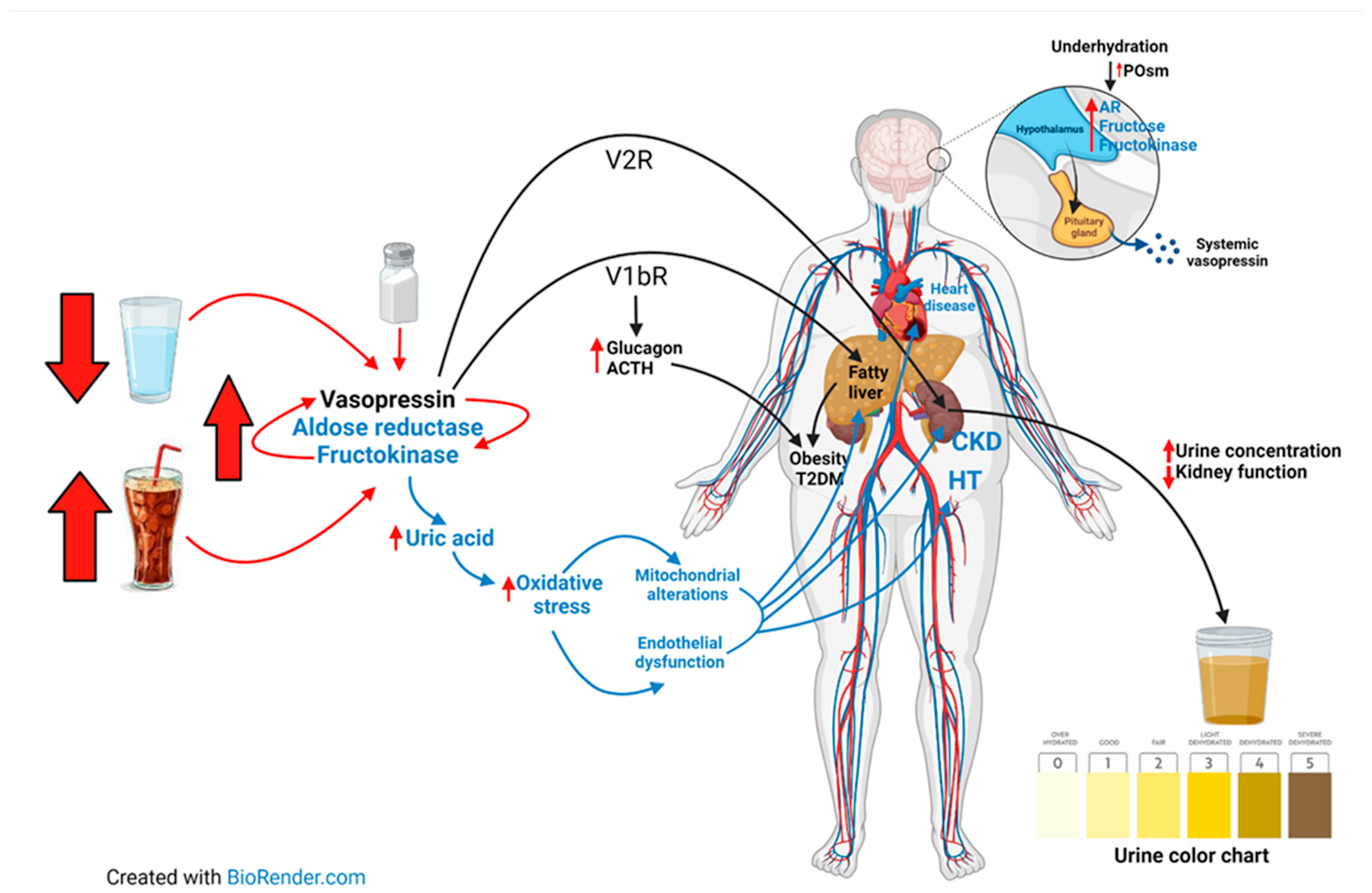 3. Mantener la hidratación. No hay que subestimar el poder del agua. Disminuir la ingesta de bebidas alcohólicas, azucaradas y refrescos, priorizando el agua, ayuda a controlar el apetito, el peso y mejora la digestión, como aparece en la imagen. Un buen indicador del estado de hidratación es la orina. Colores oscuros indican que hay que beber más agua. Para conseguirlo, se puede incorporar esta bebida en las elaboraciones, en forma de sopas muy sabrosas a base de puerro, cebolla y ajo que además ayudarán a reforzar el sistema inmunitario.
