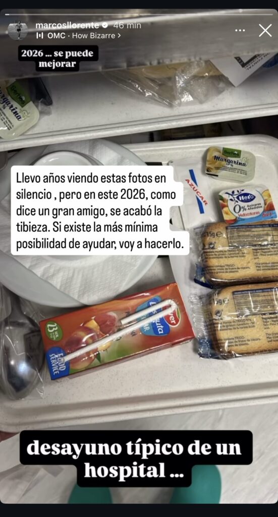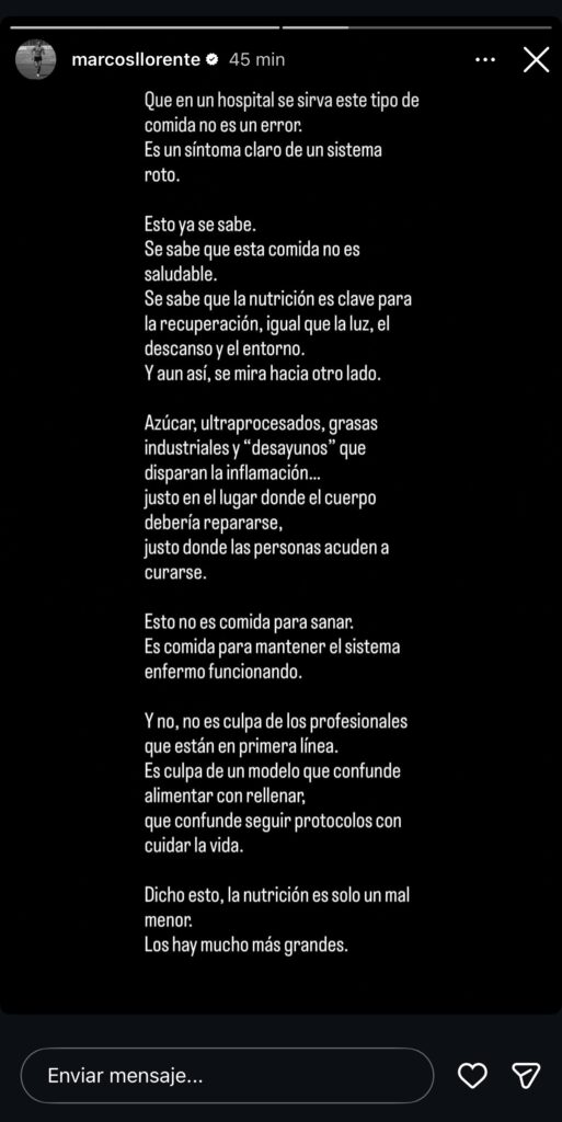 La denuncia del centrocampista rojiblanco se materializó en una imagen concreta, la fotografía de un desayuno hospitalario compuesto por dos pequeños envases de mermelada, pan y un zumo de melocotón. «Llevo años viendo estas fotos en silencio, pero en este 2026, como dice un gran amigo, se acabó la tibieza», escribía en una primera historia. «Si existe la más mínima posibilidad de ayudar, voy a hacerlo». Lejos de quedarse en la anécdota visual, Llorente utilizó las siguientes publicaciones para desarrollar una crítica directa al sistema. Afirmó que servir este tipo de comida en un hospital «no es un error, sino un síntoma claro de un sistema roto», insistiendo en que se trata de un problema conocido y normalizado.