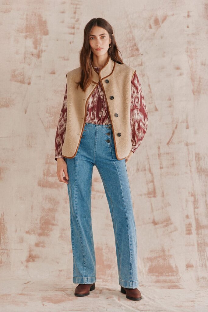 Los bolsillos de parche son un detalle destacado que suma funcionalidad y un aire desenfadado. Este chaleco es la combinación ideal para un vaquero y un jersey de cuello vuelto, logrando un estilo folk y femenino perfecto para los días más frescos.