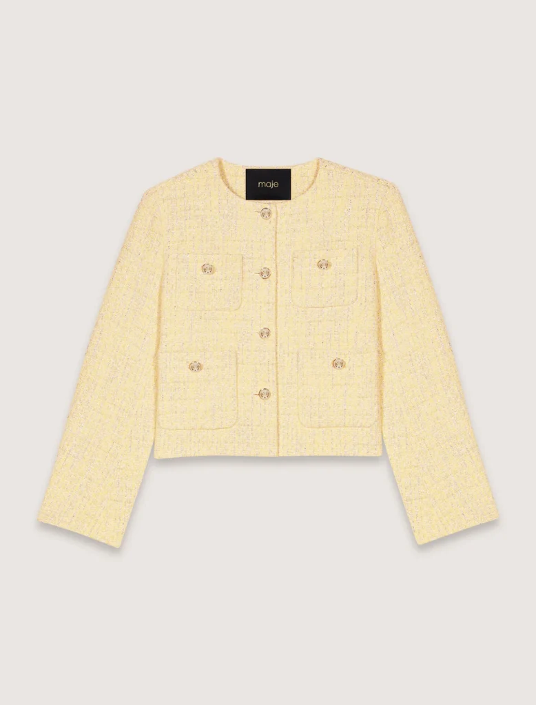 La propuesta elegida para este día es este traje de Maje en tono mantequilla, uno de los colores tendencia de la temporada, confeccionado en tweed brillante. Este conjunto de dos piezas, formado por un pantalón recto y una chaqueta corta aúna el refinamiento parisino con la elegancia atemporal del diseño italiano y se posiciona como la opción más ideal para quienes buscan un equilibrio entre modernidad, clasicismo y confort.