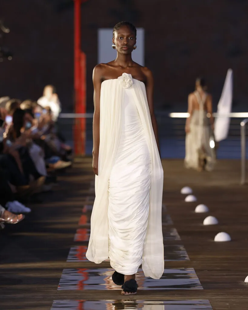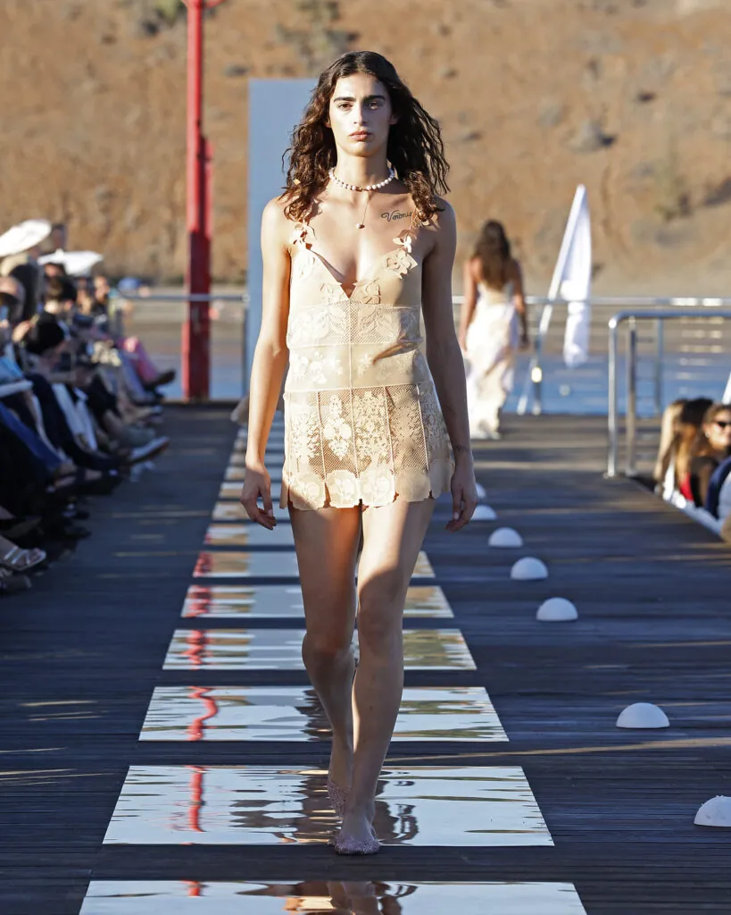 Una edición más, el Puerto Deportivo Pasito Blanco se convertía en el escenario perfecto para dar comienzo a Gran Canaria Swim Week. En esta edición, se vuelve a apostar por desfiles exteriores como herramienta fundamental para proyectar internacionalmente la isla, mostrando su clima, sus paisajes y sus entornos naturales como parte de la experiencia. La pasarela de 135 metros lineales, vestida con espejos dorados, magnífica el entorno: el cielo se dibuja en el suelo, las nubes viajan bajo los pasos de los modelos y los tonos del atardecer brillan con ellos en cada desfile. Alrededor, banderas blancas ondean como parte de la escenografía, abrazando la pasarela. La jornada inaugural comenzó con los desfiles de la firma catalana Joana Michaela a las 18.00h horas, continuando con Gisela a las 19.00h, Victoria Cimadevilla a las 20.00h, Nuria González a las 21.00h, y culminando con la británica Alexandra Miró.