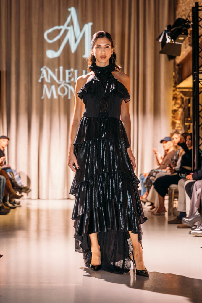 La diseñadora nicaragüense inauguró la séptima edición de Fashion Week LATAM con Divino Tesoro, una colección donde la referencia a Rubén Darío marcó el tono lírico de la jornada. Prendas boho chic de lino metalizado y chiffon dialogaron con bordados art nouveau que evocaron nostalgia, juventud y una feminidad etérea. Su paleta de negro, blanco, dorado y old rose tejió una propuesta cargada de sensibilidad literaria.