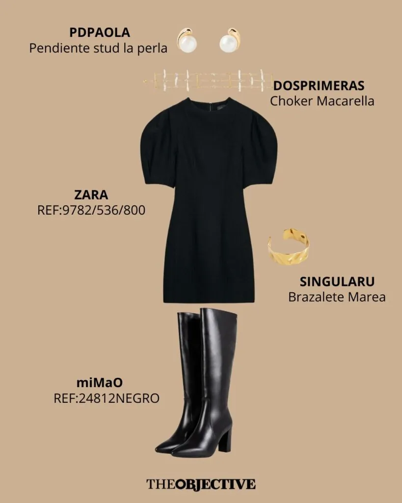 El eje del estilismo es un vestido negro de Zara que confirma por qué este color sigue siendo el aliado infalible de cualquier fondo de armario festivo. Su cuello redondo y las mangas cortas abullonadas aportan una silueta depurada que enmarca los hombros con un aire contemporáneo, mientras que las costuras marcadas estilizan y ordenan la figura con una precisión casi arquitectónica. El cierre con cremallera oculta en la espalda mantiene la pureza de líneas que define este diseño y lo convierte en una base potente, capaz de recibir accesorios de carácter sin perder sofisticación.