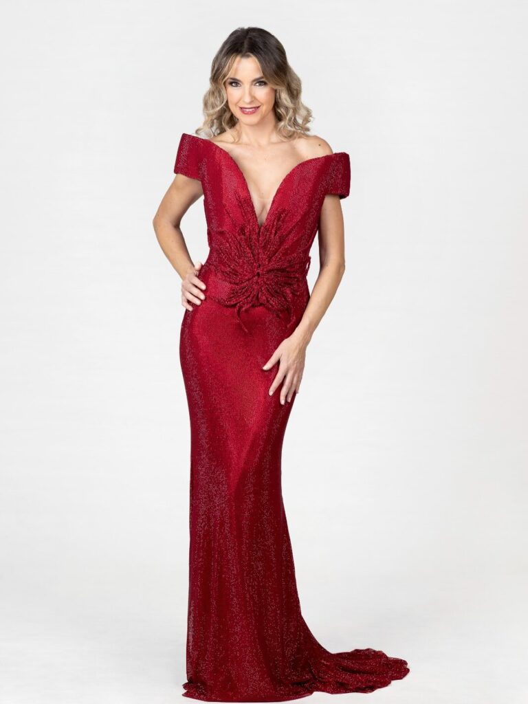 La presentadora de Telemadrid eligió un vestido de Rubén Hernández Costura en tono rojo rubí, con corte recto, escote Bardot pronunciado y una maxi flor tridimensional en la cintura. Los microcristales del tejido aportaban luz y sofisticación, mientras que la flor añadía un toque de teatralidad sin excederse. Un acierto que combina tradición y modernidad, mostrando que un color potente y un buen corte siguen siendo fórmulas ganadoras para una noche de máxima visibilidad.