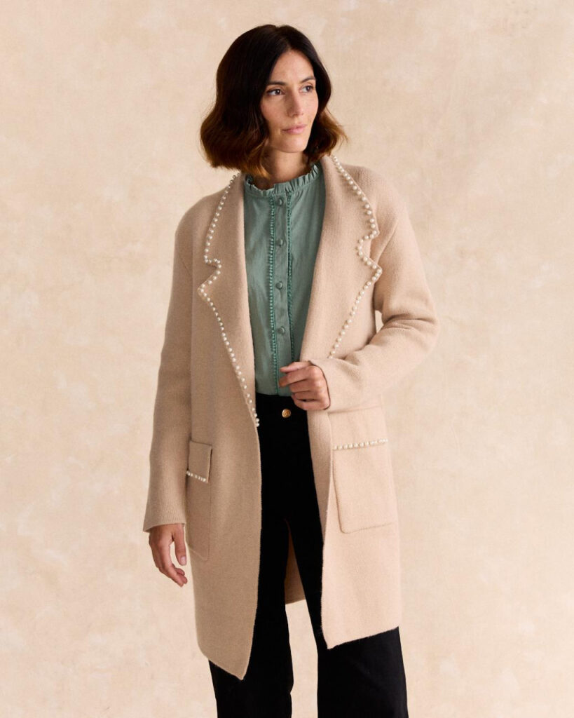 Este abrigo largo de paño en color beige de la marca POLÍN ET MOI es práctico y con un toque elegante. Su clásico cuello de solapa le dan un aire atemporal, y aunque es un tono más oscuro que el de Marta Lozano, es perfecto tanto para el día a día como para ocasiones especiales. Y es que los detalles de perlas en el ribete aportan un toque muy femenino y sofisticado, elevando incluso los looks más sencillos. Para combinarlo, apuesta por jeans ajustados o pantalones neutros, un jersey de punto suave, botines bajos o mocasines y un bolso pequeño o bandolera para un estilo urbano y elegante.
